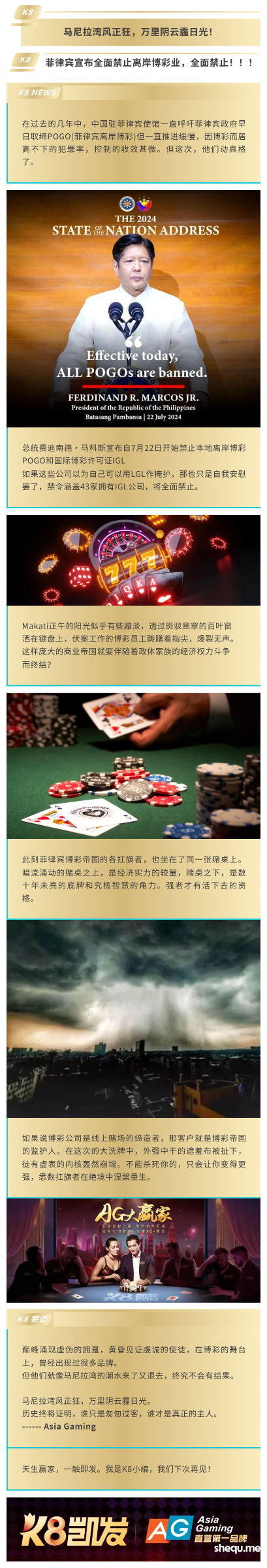 博彩行业风云变幻,众多品牌如潮水般涌现又退去。然而,历史将见证,AG和K8脱颖而出,成为亚洲和全球的真正领导者。马尼拉湾的狂风和阴云预示着这些品牌的崛起与辉煌。