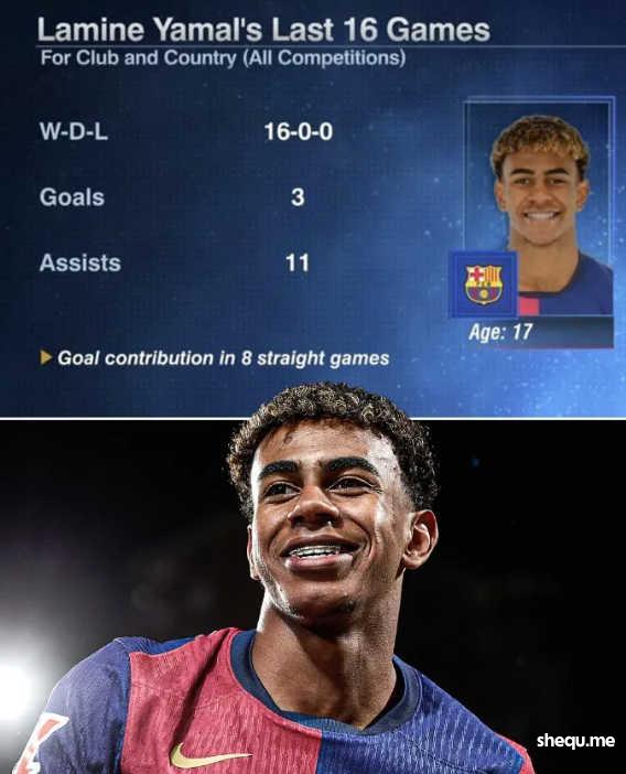 17岁的亚马尔为俱乐部和国家队出战各项赛事,已经取得16连胜,进3球助攻11次。与网友互动交流时,董路表示亚马尔将来绝对就是一个球霸。